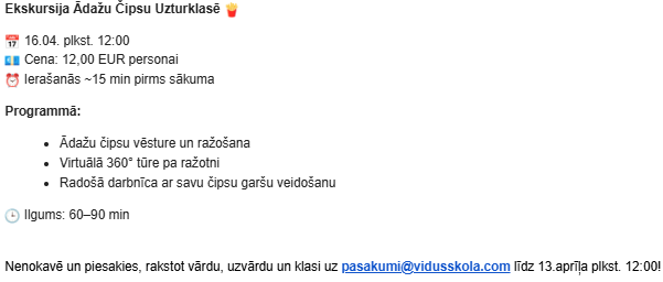 Aicinām pieteikties skolas pašpārvaldei, nosūtot motivācijas vēstuli uz e-pastu pasakumi@vidusskola.com. Vēstulē pastāsti, kāpēc tieši Tu būtu vērtīga pašpārvaldes sastāvdaļa — kādas ir Tavas idejas, prasmes un motivācija darboties.